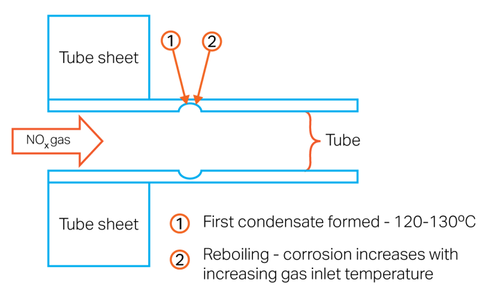 When dealing with higher temperatures and concentrations of nitric acid, you may notice some corrosion problems in the hot inlet of the cooler/condenser or tailgas preheater. As shown in the diagram below, when nitrogen oxide (NOx) gases condense at temperatures of 120-130°C and the hot droplets reboil, corrosion can be initiated. Re-tubing from 304 or 304L to a higher alloy material such as Alleima® 2RE10 can prevent this and safeguard operations at about 20% higher temperature. This is due to the material’s low impurity levels and higher chromium content, which increases corrosion resistance.