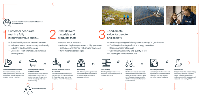 Obchodní model společnosti Alleima si klade za cíl zajišťovat rentabilní růst a vytvářet přidanou hodnotu pro zainteresované subjekty. Udržitelnost je klíčovou a nedílnou součástí celého hodnotového řetězce.