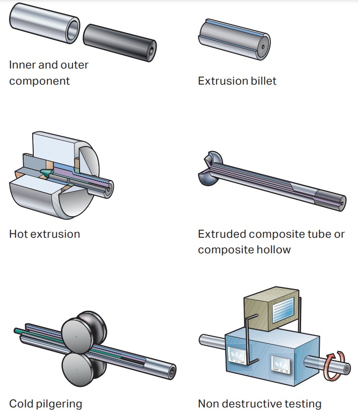 Figure 2. Alleima composite tubes consist of two different materials metallurgically bonded together through hot extrusion. By selecting the correct alloy for the outside and inside component, the corrosion resistance and the mechanical properties are optimised and a tube that meets conflicting material requirements inside and outside is obtained.