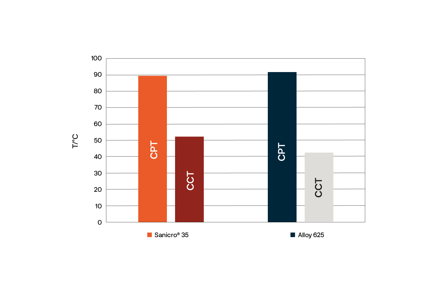 A common cause of corrosion in refinery applications such as overhead condensers and hydrotreater heat exchangers is fouling from ammonium chloride (NH4Cl ). Ammonium chloride can cause under deposit corrosion, pitting corrosion, and stress corrosion cracking. Sanicro® 35 has in advanced laboratory testing shown to have the same resistance towards this kind of corrosion as Alloy 625, (see above diagram). In modified ASTM G150 tests, Sanicro® 35 has shown similar pitting resistance to Alloy 625. In ASTM G48 Method D, Sanicro® 35 has shown better crevice corrosion resistance than Alloy 625.