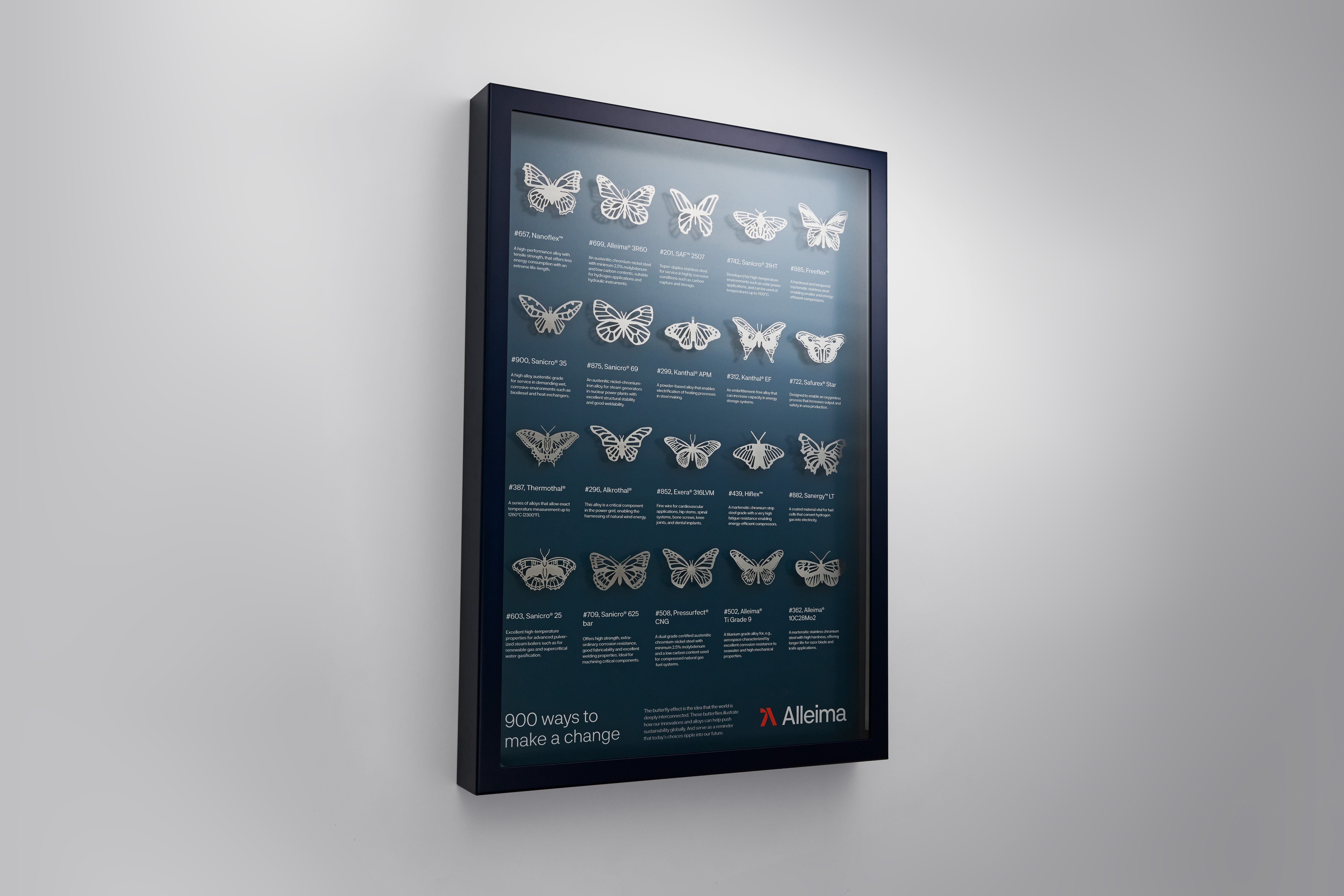 Alleima holds a portfolio of around 900 alloy compositions, manufactured with more than 80% recycled materials and with fossil-free electricity. Each butterfly symbolizes one of these alloys. The butterflies serve as a reminder of how the choices made today ripple into our future and how material choices have a lasting impact on the planet.