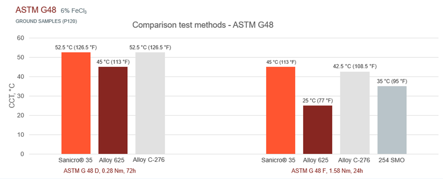 Figure 3: CCT-values for Sanicro® 35 compared to other alloys using ASTM G 48 Method D and F.