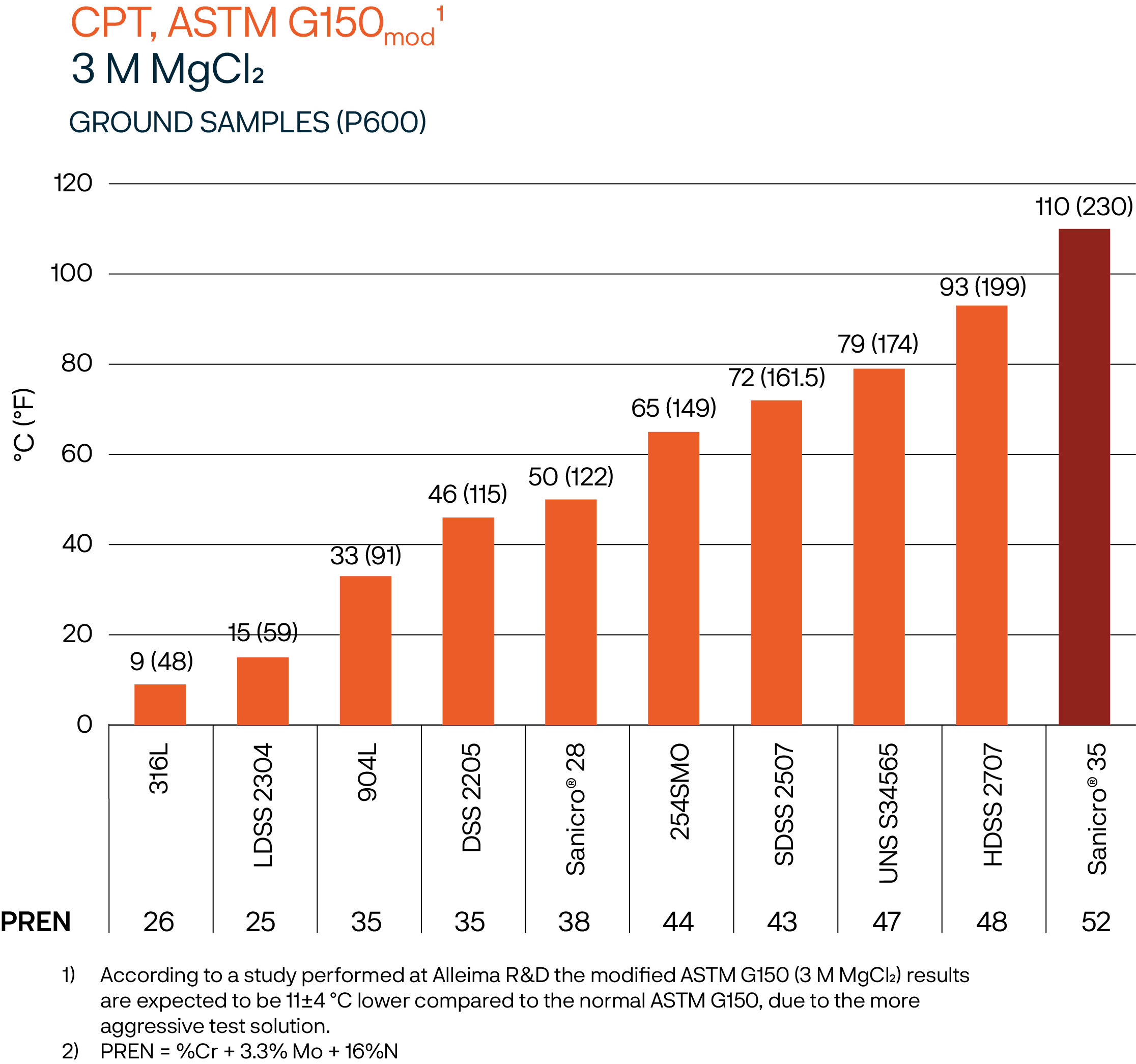 Figure 1: CPT- values for Sanicro® 35 and other alloys performed by modified ASTM G150.