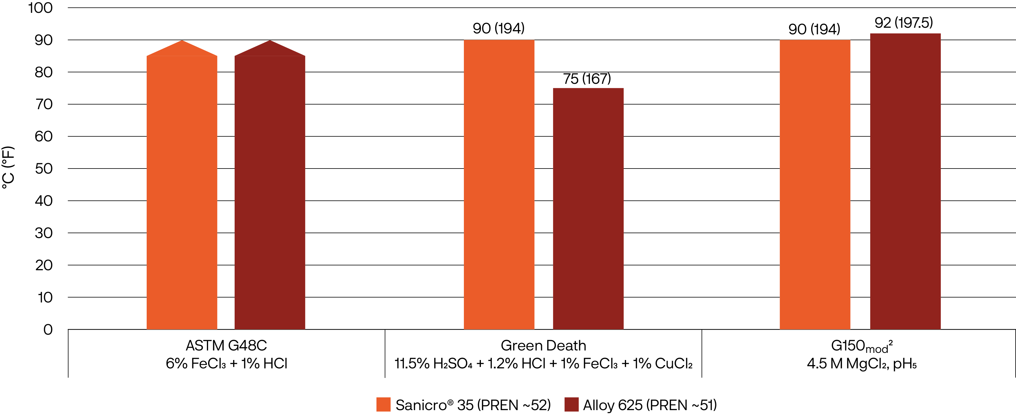 Figure 2 compares the critical pitting temperature (CPT) of Sanicro® 35 and Alloy 625. This chart shows the results from testing according to ASTM G48 Method C, which has a testing temperature limit of 85 °C, green death, and modified and more aggressive 4.5M MgCl2 ASTM G150 solution.
