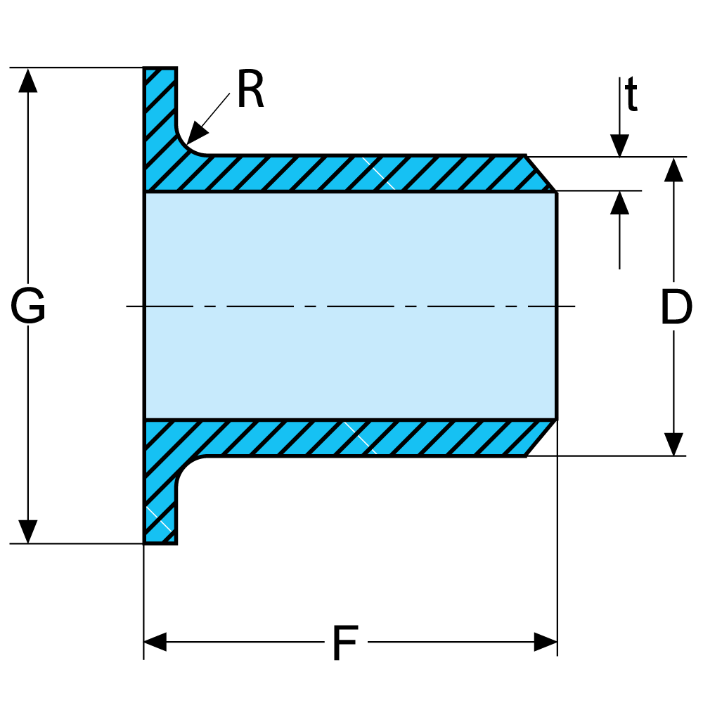 | in. | D | t | G | F | R. max. | kg/pce | 304/304L | 316/316L | S31803 | |