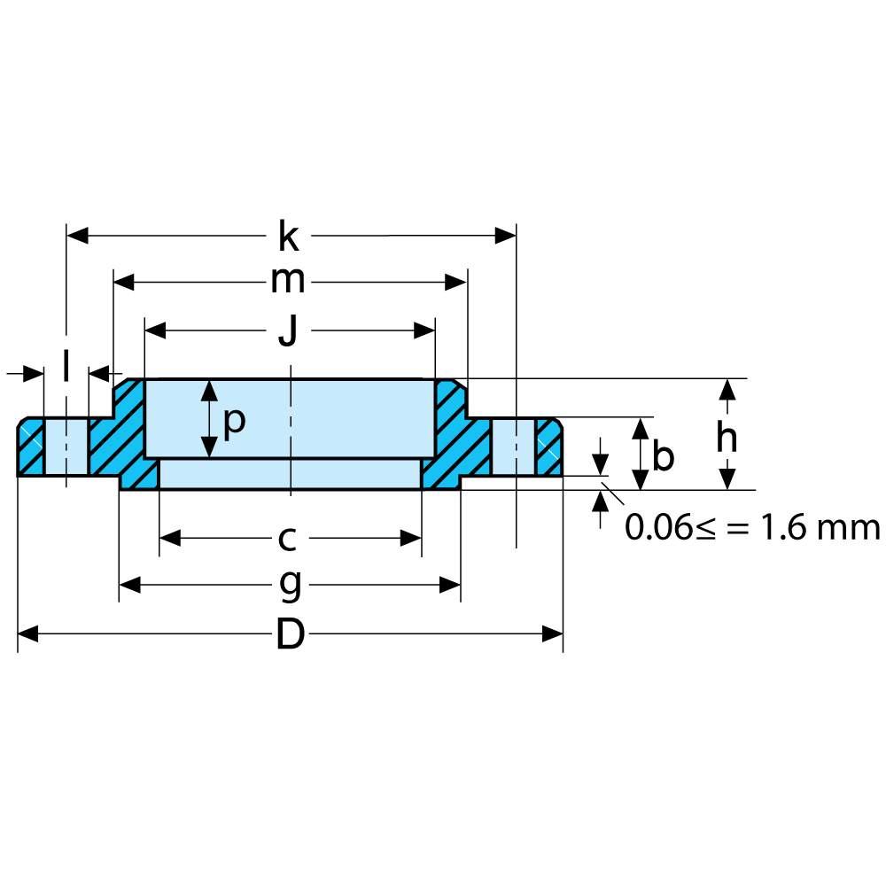 Nom. size O.D.1 D J c P b h m g No. of holes l k kg/pce ASTM 304L ASTM 316L
