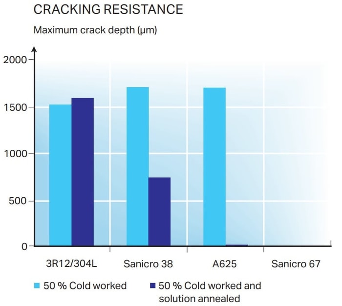 - The low work-hardening rate of Sanicro® 67 significantly reduces the risk of cracking compared to other corrosion resistance alloys such as alloy 625.