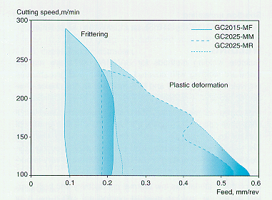 The ranges are limited in the event of low feeds because of unacceptable chip breaking. In the case of high cutting speeds, plastic deformation is the most dominant cause of failure. When feed increases and the cutting speed falls, edge frittering (chipping) increases significantly. The diagram is applicable for short cutting times. For long, continuous cuts, the cutting speeds should be reduced somewhat.