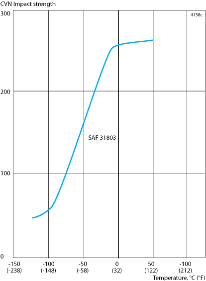 SAF™ 31803 possesses good impact strength both at room temperature and at low temperatures, as is evident from Figure 1. The values apply for standard Charpy-V specimens (10 x 10 mm, 0.39 x 0.39 in.).