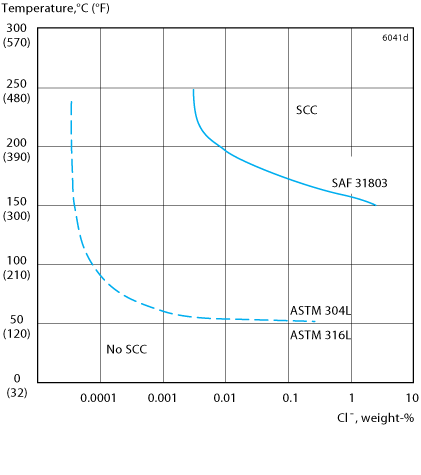 The standard austenitic steels ASTM 304L and ASTM 316L are prone to stress corrosion cracking (SCC) in chloride-bearing solutions at temperatures above 60 °C (140 °F).