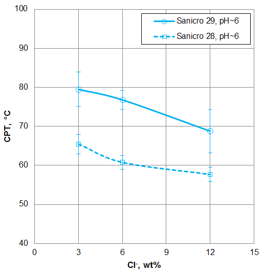 Potentiostatic tests, based on modified ASTM G150, on cold worked Sanicro® 29 in solutions with different chloride concentrations and pH values are presented in Figure 2 and Figure 3, respectively. In these tests the critical pitting temperature (CPT) is determined in oxidizing conditions at the potential of +600 eV versus SCE. However, the conditions in wells are significantly less oxidizing, resulting in actual CPT values being higher than those presented in the figures. Figure 2 shows the CPT values as a function of chloride concentration. Also shown are results from similar measurements on Sanicro® 28 demonstrating that Sanicro® 29 performs better in such environments. In Figure 3, CPT values are presented as a function of pH.