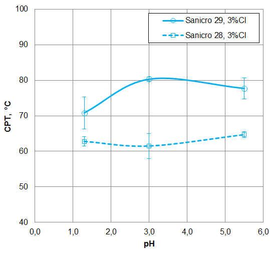 Figure 3. Critical pitting temperature (CPT) as a function of pH for cold worked Sanicro® 29 and Sanicro® 28 in a 3% Cl- solution. The potential was +600 mV vs. SCE.
