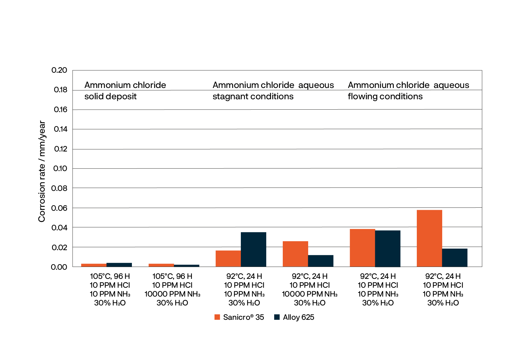 Sanicro® 35は、この種の腐食に対してAlloy 625と同等の耐性を持つことが、先進的な実験室試験で示されています(上図参照)。